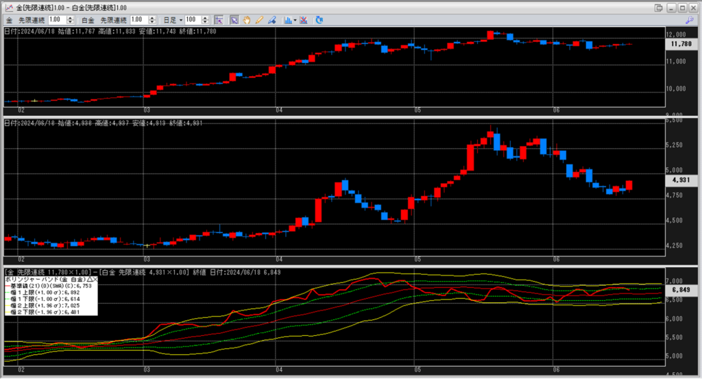 金白金の鞘をボリンジャーバンドで見ていきます。