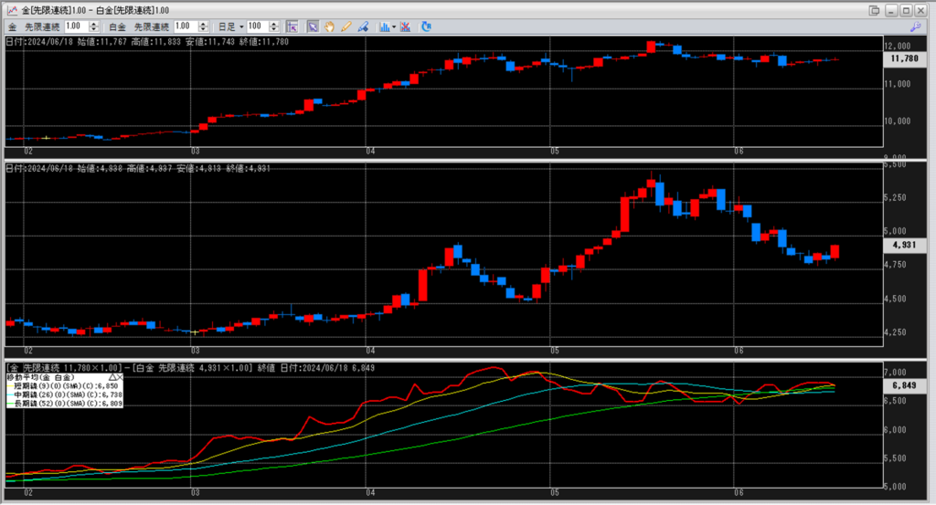 下記に金白金鞘の移動平均線のチャートを貼り付けています。