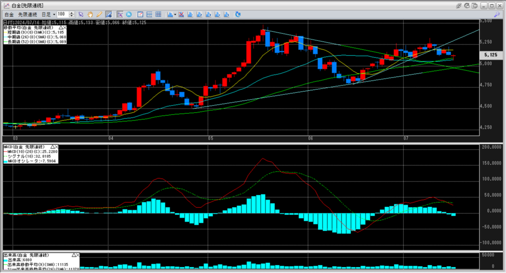 白金は、上昇トレンドと短期線を割り込み、MACDはデッドクロスとなっています。