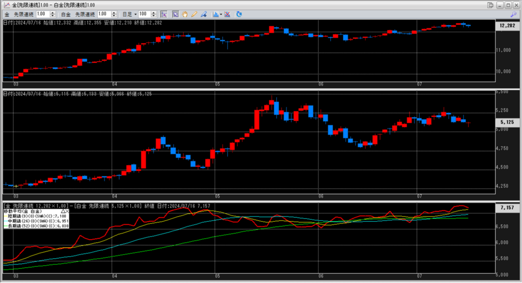 下記に金白金鞘の移動平均線のチャートを貼り付けています。