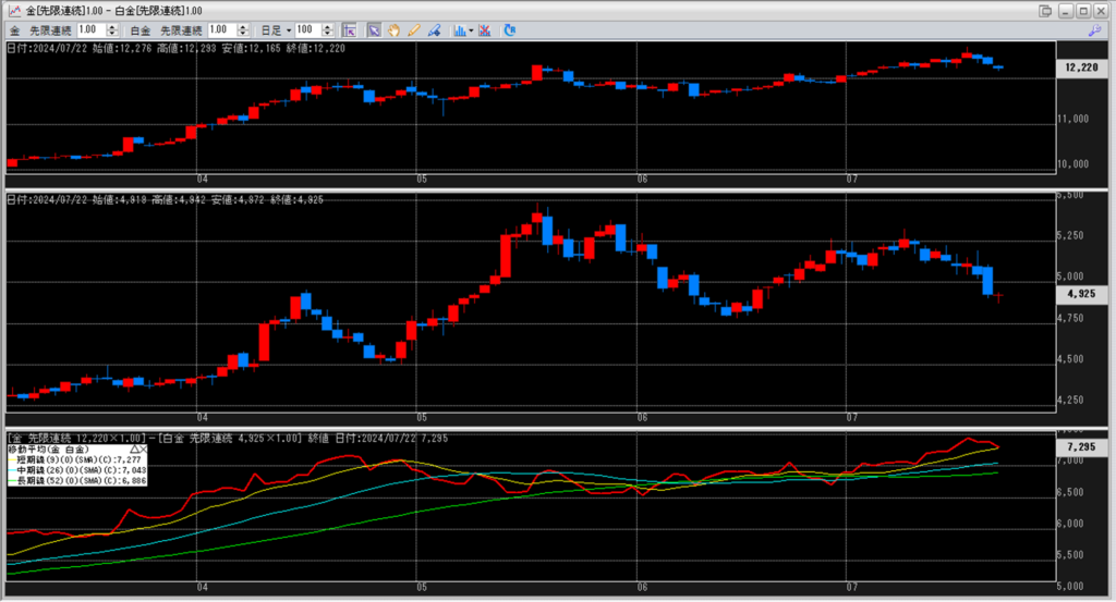 下記に金白金鞘の移動平均線のチャートを貼り付けています。