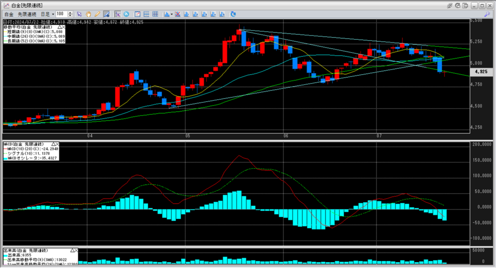 全ての移動平均線を割り込んできており、目先は白金価格は下落傾向か。