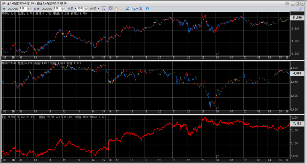 下:金白金鞘(金白金の価格差 = 金1グラムの価格 - 白金1グラムの価格)