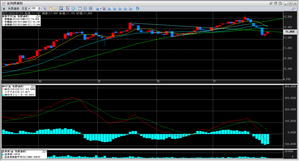 金のチャートをみると、5月半ばの当時史上最高値12,283円から