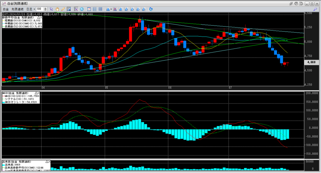 移動平均線の中で一番下に位置している短期線4,832円を割り込んで、