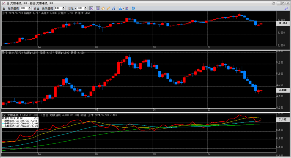 下記に金白金鞘の移動平均線のチャートを貼り付けています。