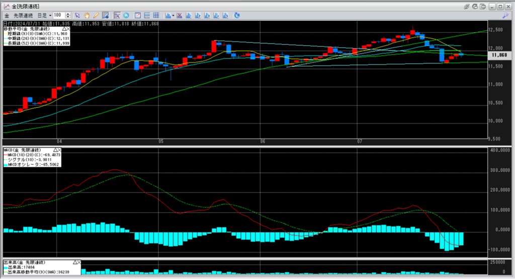金のチャートをみると、5月半ばの当時史上最高値12,283円から