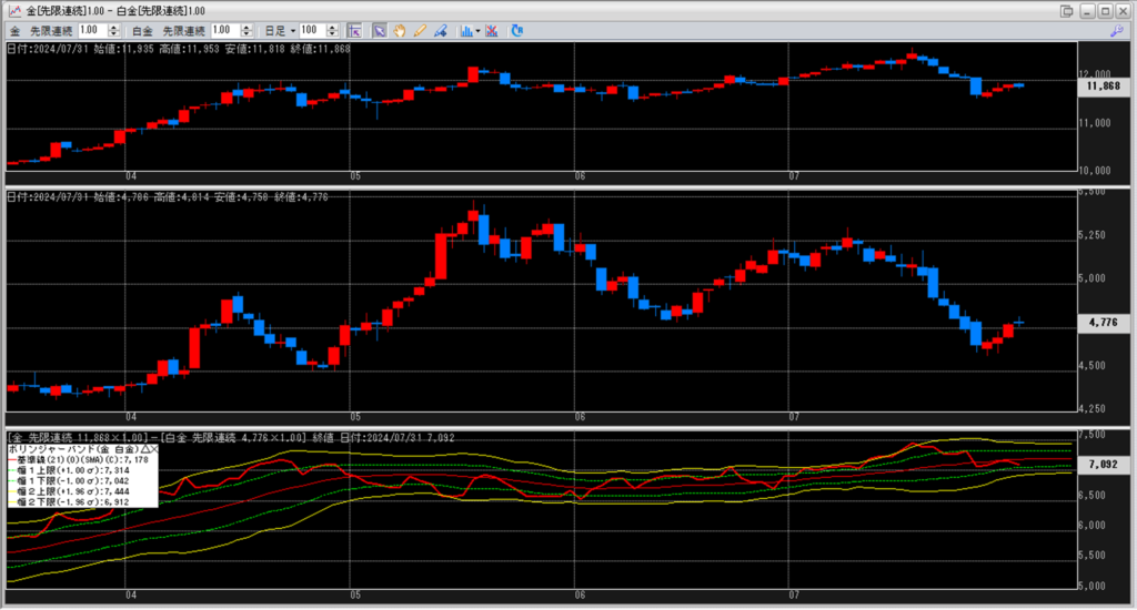 金白金の鞘をボリンジャーバンドで見ていきます。
