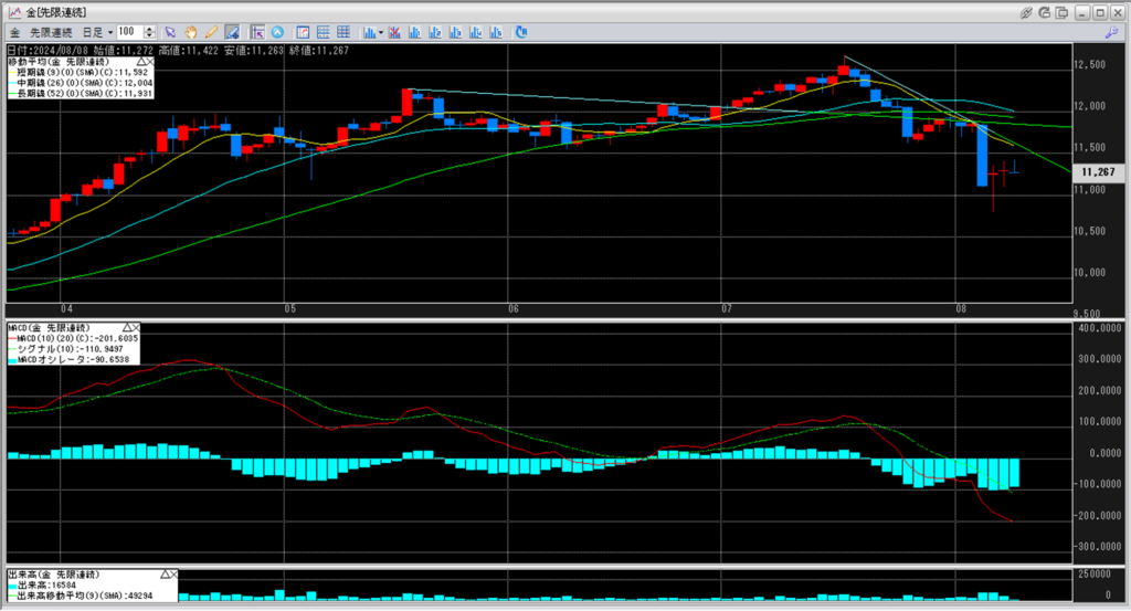金のチャートをみると、5月半ばの当時史上最高値12,283円から