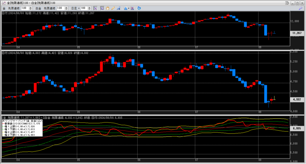 金白金の鞘をボリンジャーバンドで見ていきます。