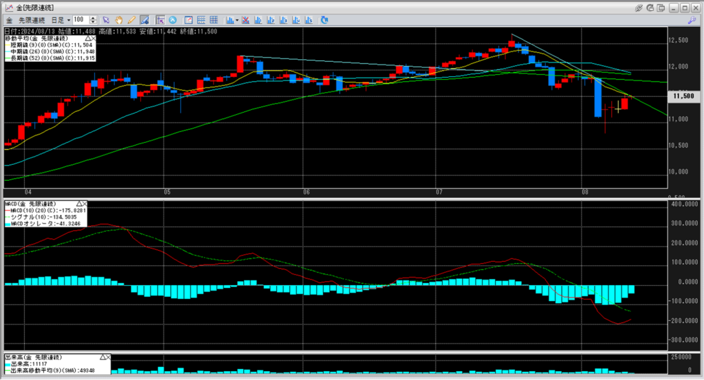 金のチャートをみると、5月半ばの当時史上最高値12,283円から