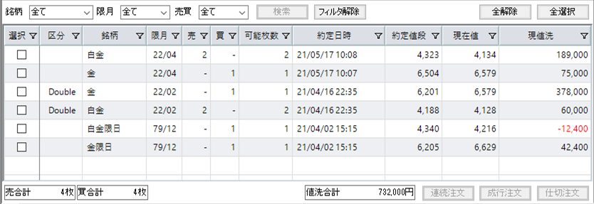 片張りでは、金限日買い1枚、白金限日買い1枚は保有し続けています。