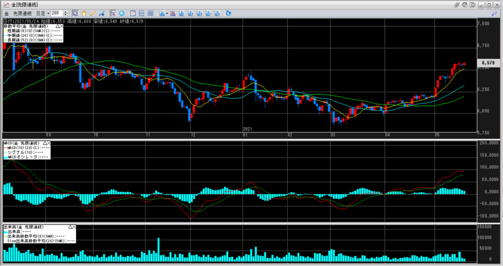 変わらず、移動平均の短期線、中期線、長期線は、上向きになっています。