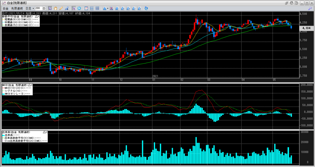 2021年5月21日8:45~5月22日5:30 金白金鞘値動きのチャートを張り付けています。