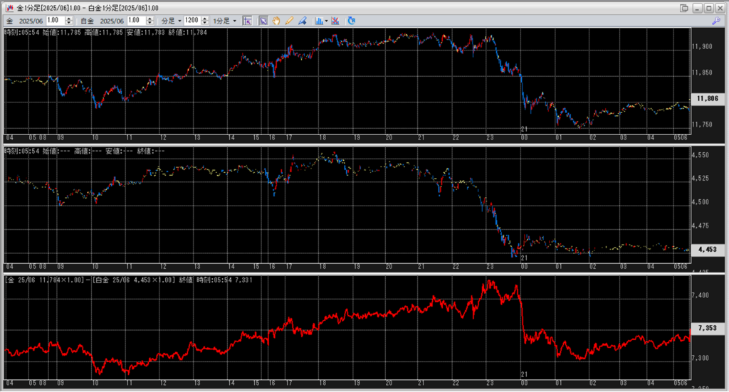 下:金白金鞘(金白金の価格差 = 金1グラムの価格 - 白金1グラムの価格)