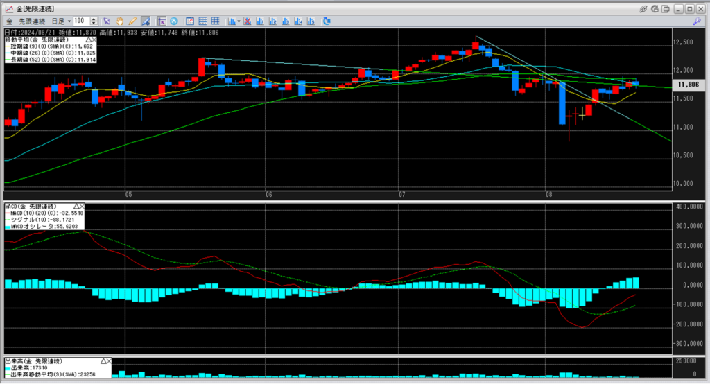 移動平均線の真ん中に位置している中期線11,825円を割り込んで、