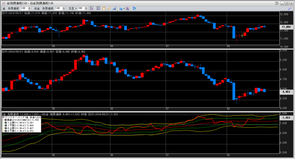 金白金の鞘をボリンジャーバンドで見ていきます。