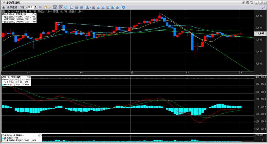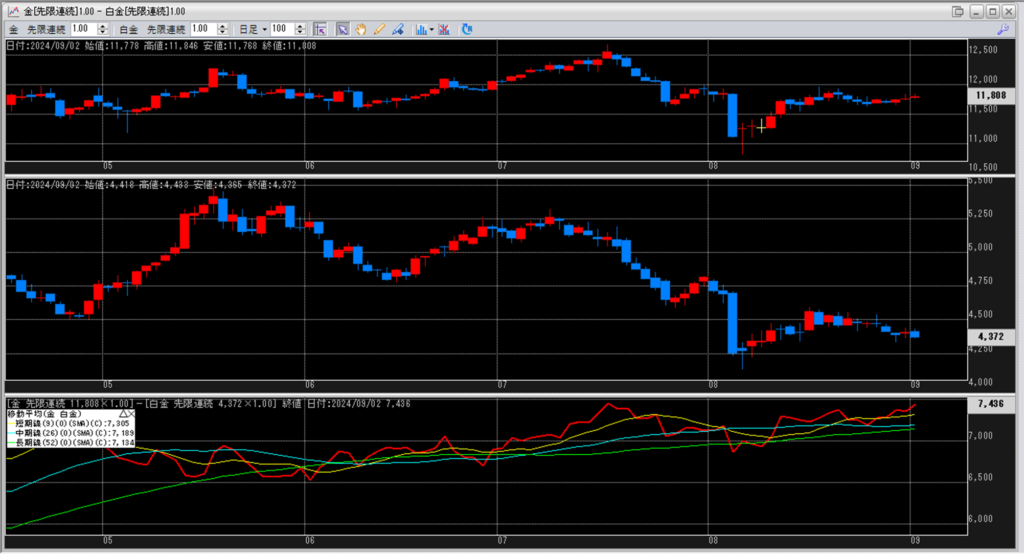 下記に金白金鞘の移動平均線のチャートを貼り付けています。
