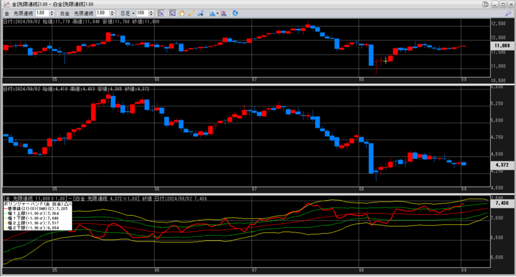 金白金の鞘をボリンジャーバンドで見ていきます。