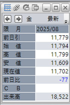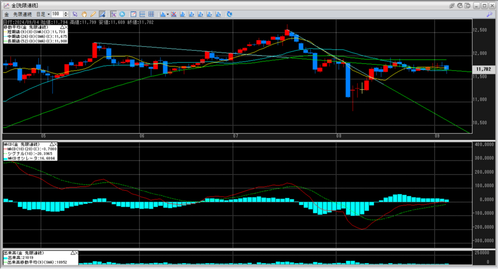 移動平均線の真ん中に位置している短期線11,733円を割り込んで、