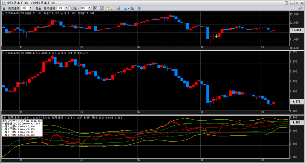 金白金の鞘をボリンジャーバンドで見ていきます。