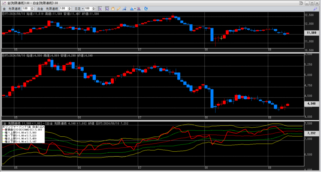 金白金の鞘をボリンジャーバンドで見ていきます。