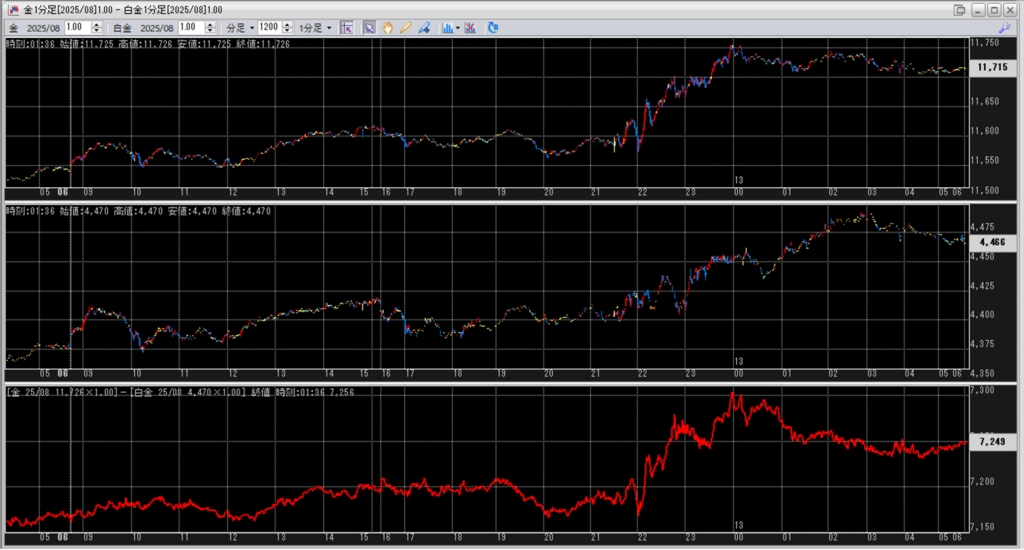 下:金白金鞘(金白金の価格差 = 金1グラムの価格 - 白金1グラムの価格)