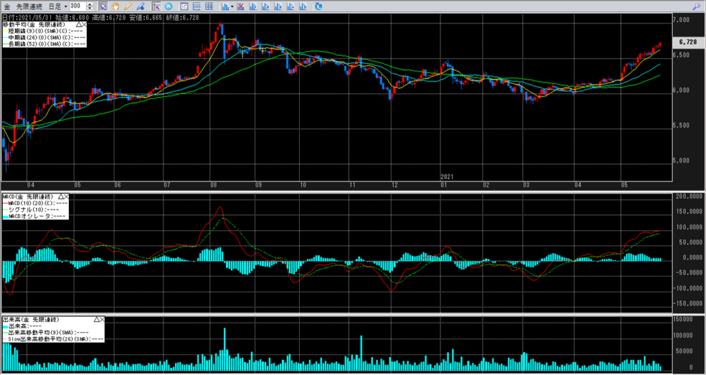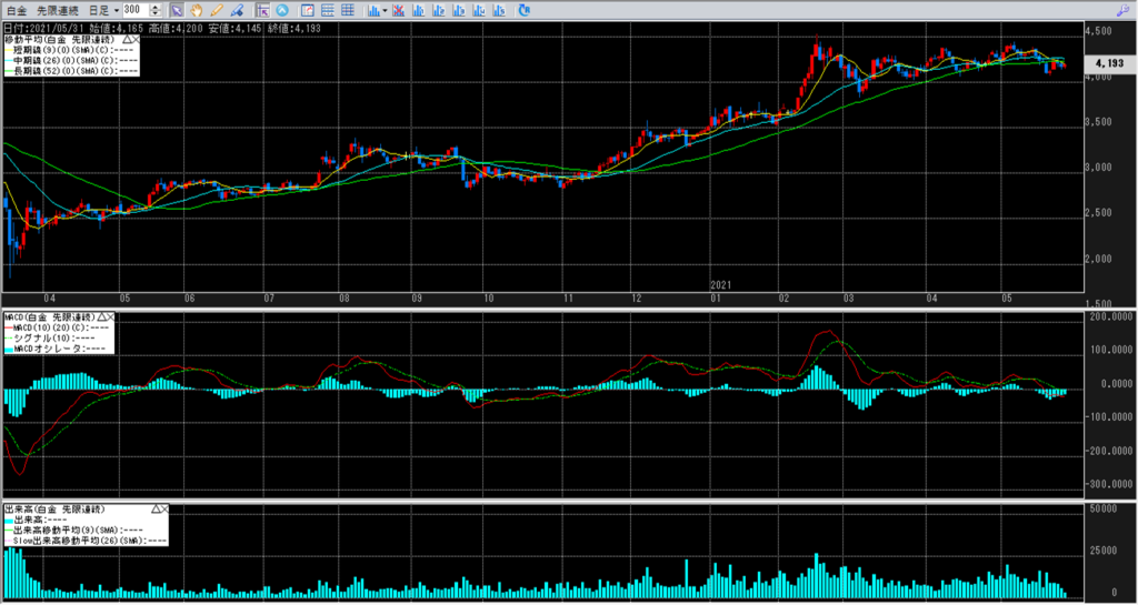 2021年5月28日8:45~5月29日5:30 金白金鞘値動きのチャートを張り付けています。