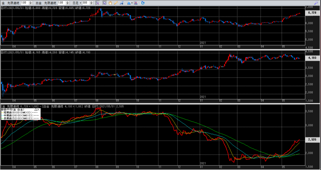 金白金と短期線は、付かず離れず、一緒に動いています。