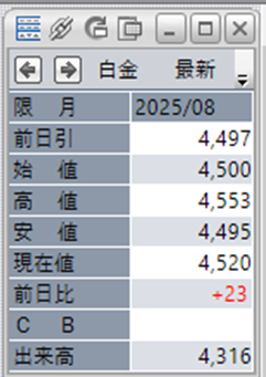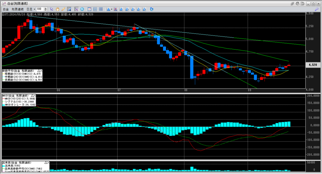 ですが、抵抗線となっている4,500円近くでの白金価格の値動きが続いています。