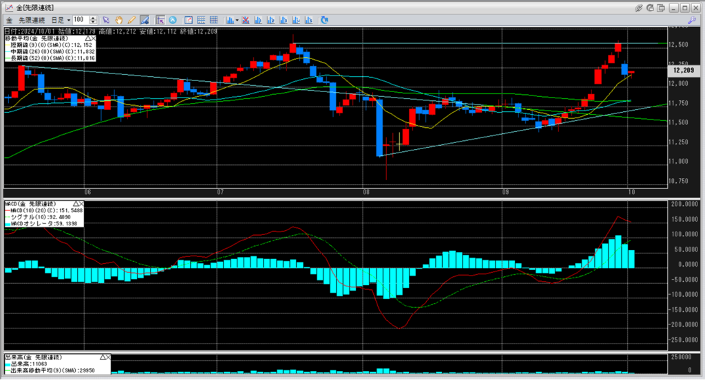 途中、12,000円超えを維持し、下落トレンドを超え、金価格は上がってきました。