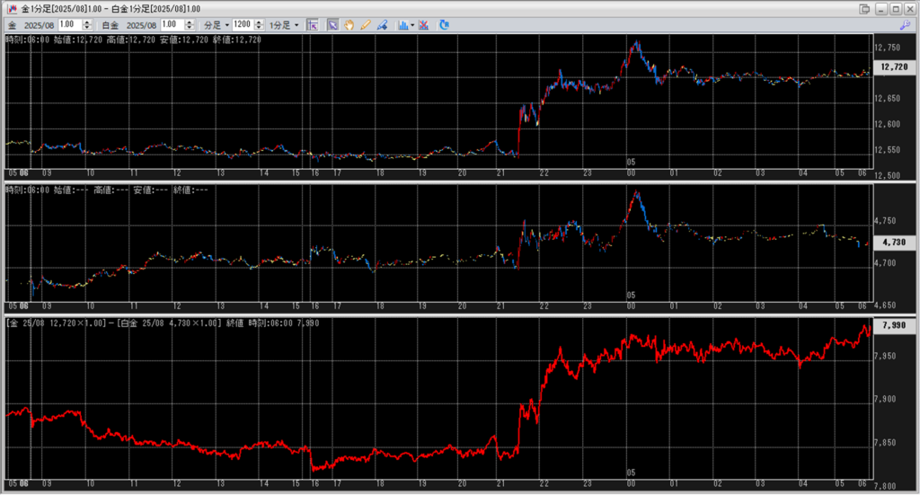 下:金白金鞘(金白金の価格差 = 金1グラムの価格 - 白金1グラムの価格)