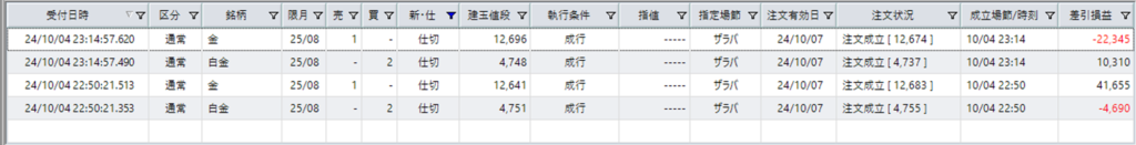 鞘拡大の仕掛け金買い1枚-白金売り2枚を2回、仕掛けています。