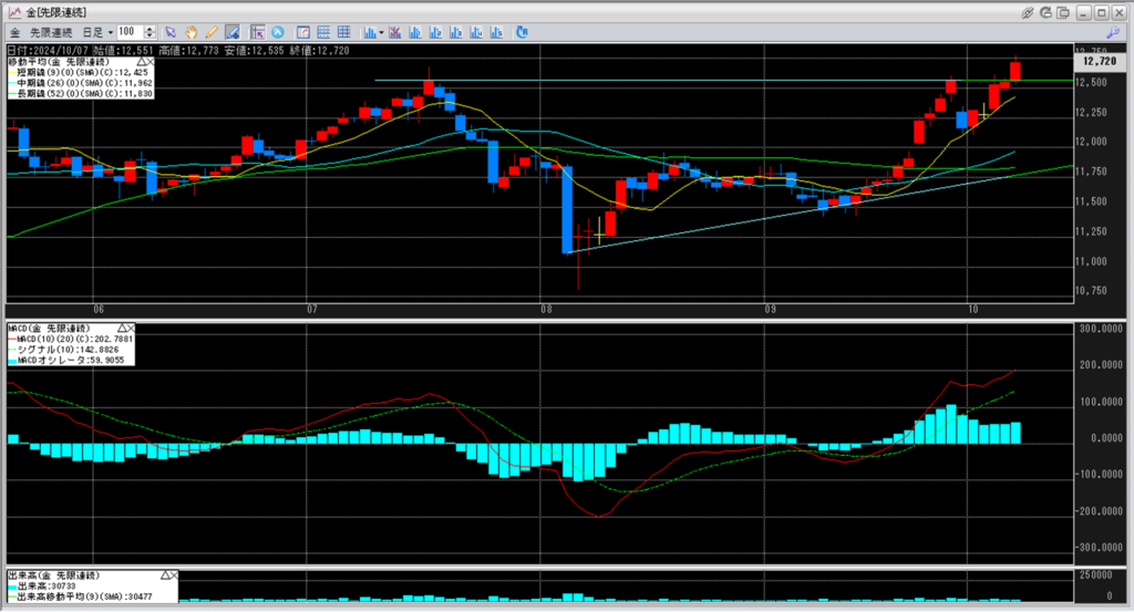 移動平均線の一番上に位置している短期線12,425円を越えて、