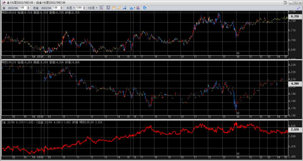 昨日、仕掛けた金買い1枚-白金売り2枚の仕掛けにも運よく、