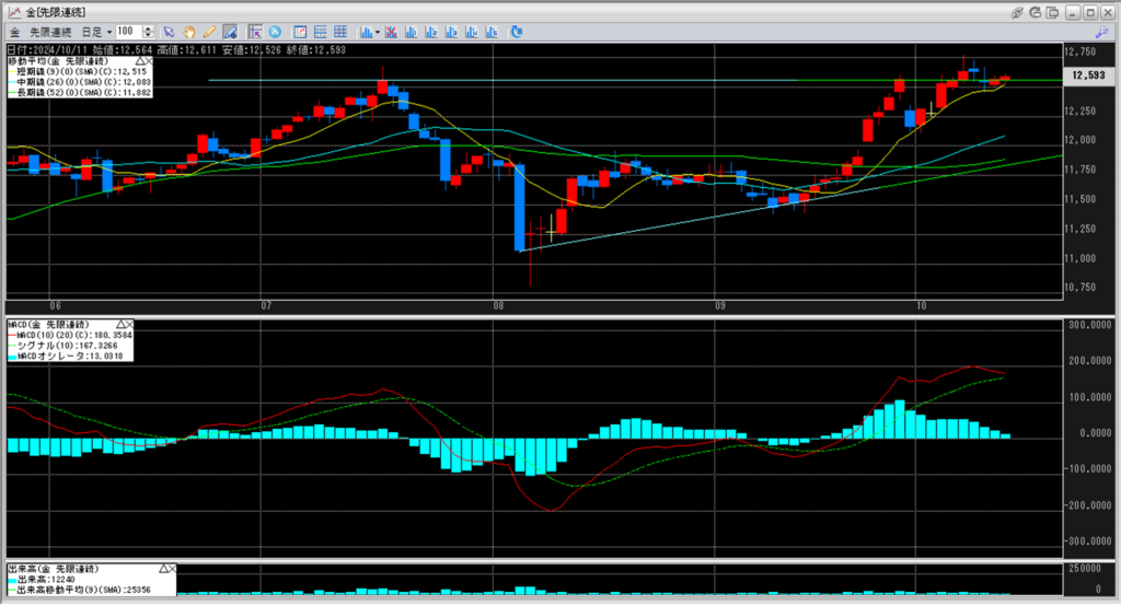 移動平均線の一番上に位置している短期線12,515円を越えて、