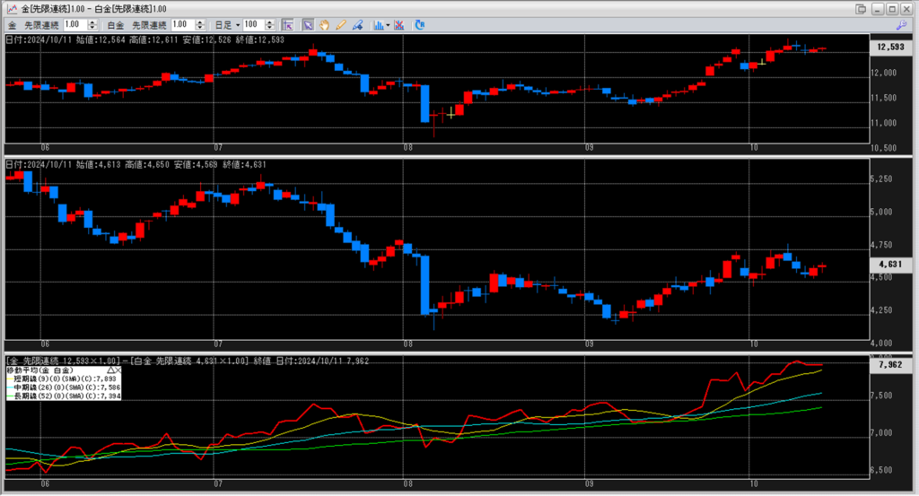下記に金白金鞘の移動平均線のチャートを貼り付けています。