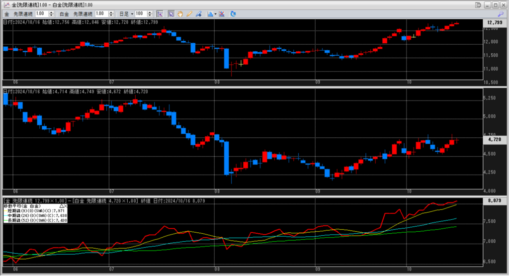 下記に金白金鞘の移動平均線のチャートを貼り付けています。