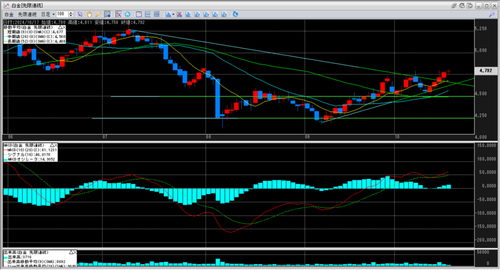 下げることなく折り返していますので、白金価格は意外と強いのかもしれません。