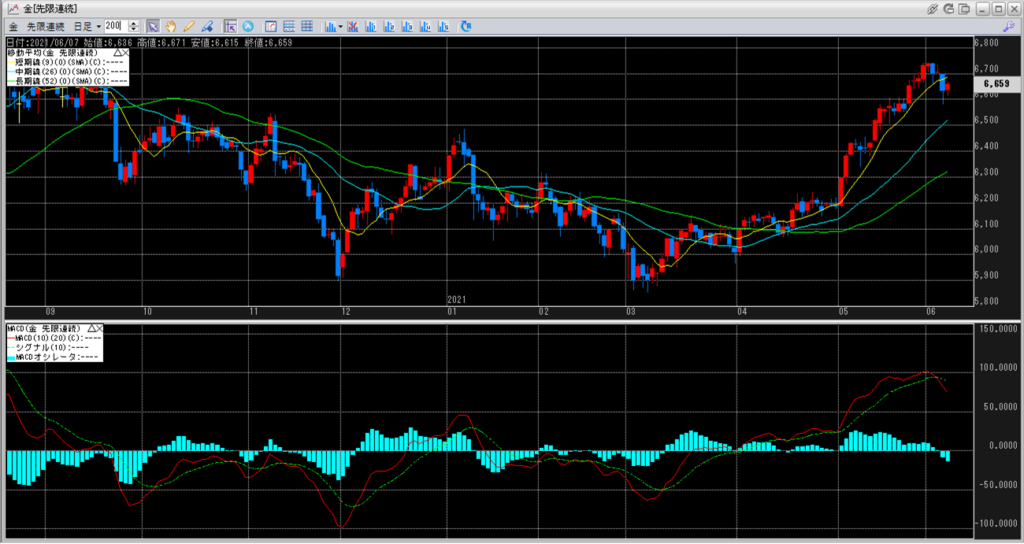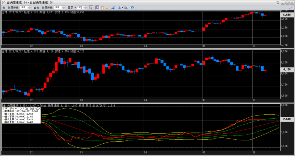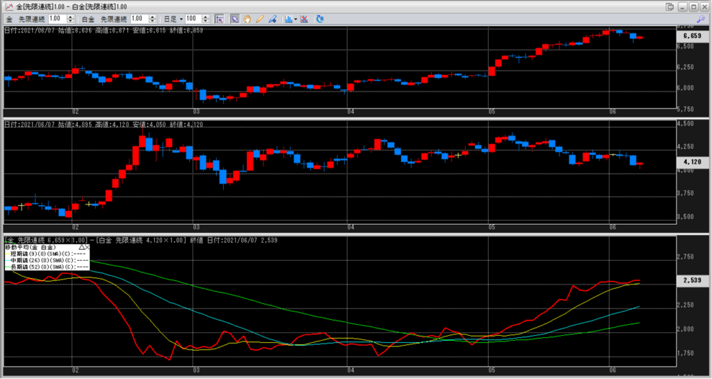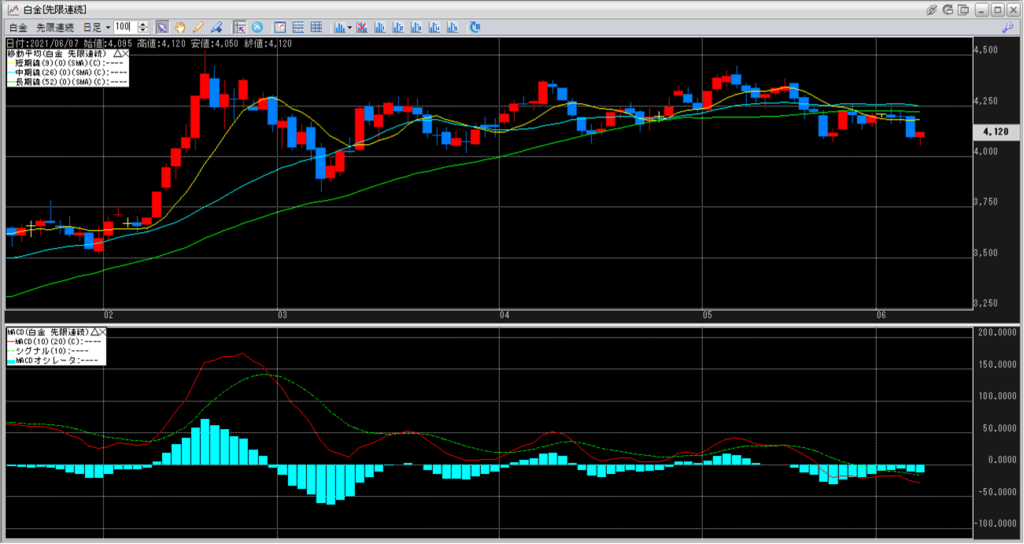 2021年6月4日8:45~6月5日5:30 金白金鞘値動きのチャートを張り付けています。