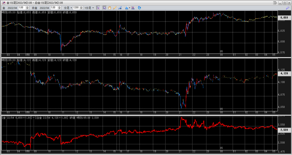 新規に建てた鞘拡大の仕掛け金買い1枚-白金売り2枚をもう仕切ってしまいそうになりつつ、