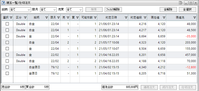 鞘拡大の仕掛け金買い1枚-白金売り2枚を3組の状況です。