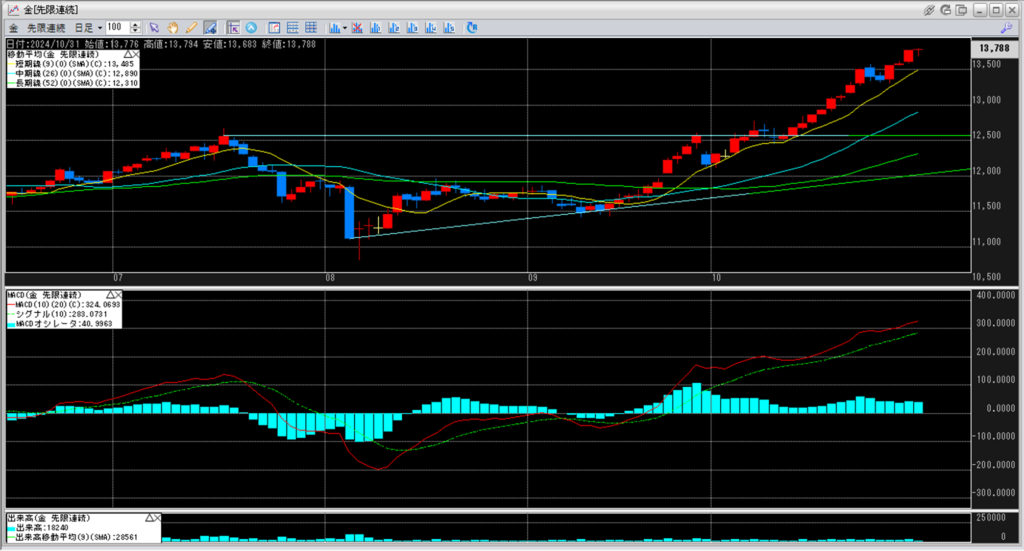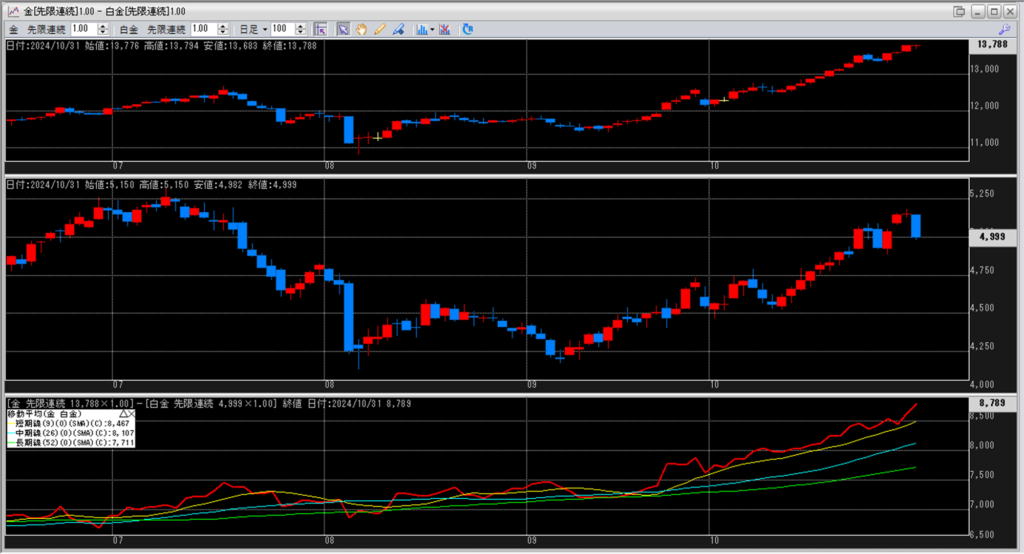 下記に金白金鞘の移動平均線のチャートを貼り付けています。