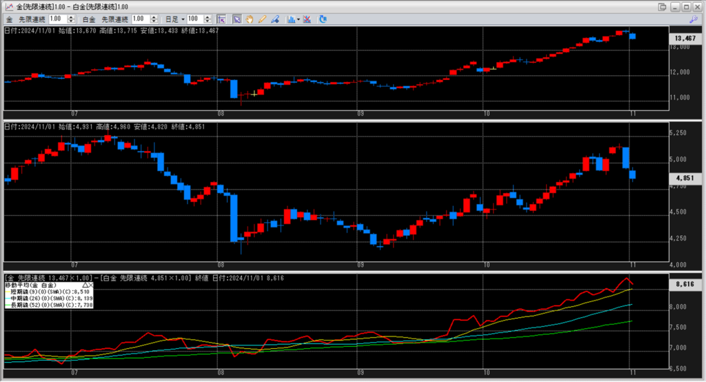 下記に金白金鞘の移動平均線のチャートを貼り付けています。