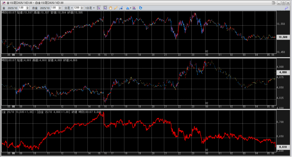 下:金白金鞘(金白金の価格差 = 金1グラムの価格 - 白金1グラムの価格)