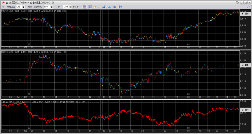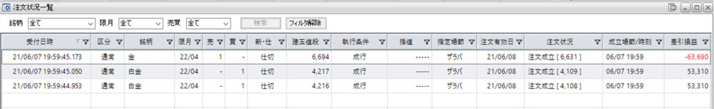 していますが、昨夜、新規に仕掛けた金買い1枚-白金売り2枚の仕掛けを手仕舞いしました。