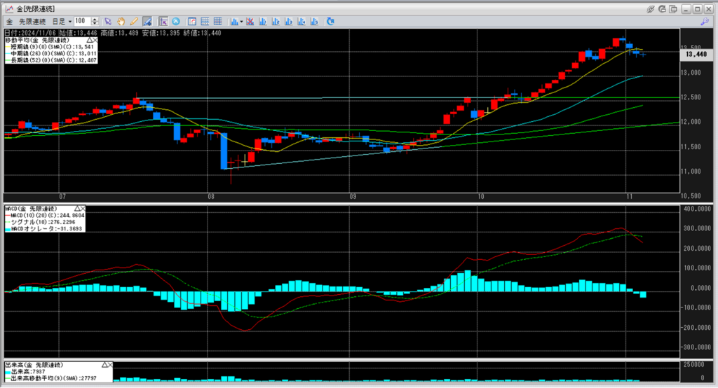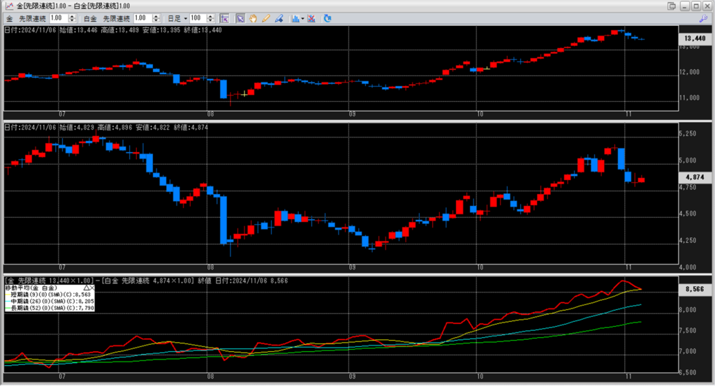 下記に金白金鞘の移動平均線のチャートを貼り付けています。