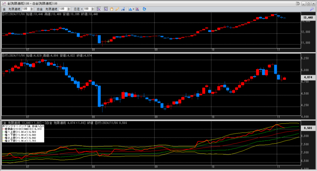 下記に金白金鞘のボリンジャーバンドのチャートを貼り付けています。