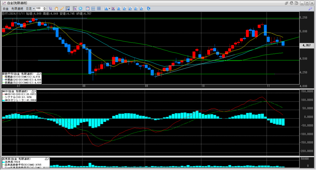 白金単体で見ると、前日比で-84円となっております。