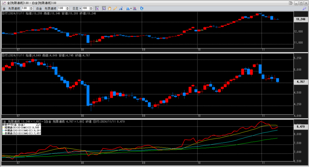 下記に金白金鞘の移動平均線のチャートを貼り付けています。